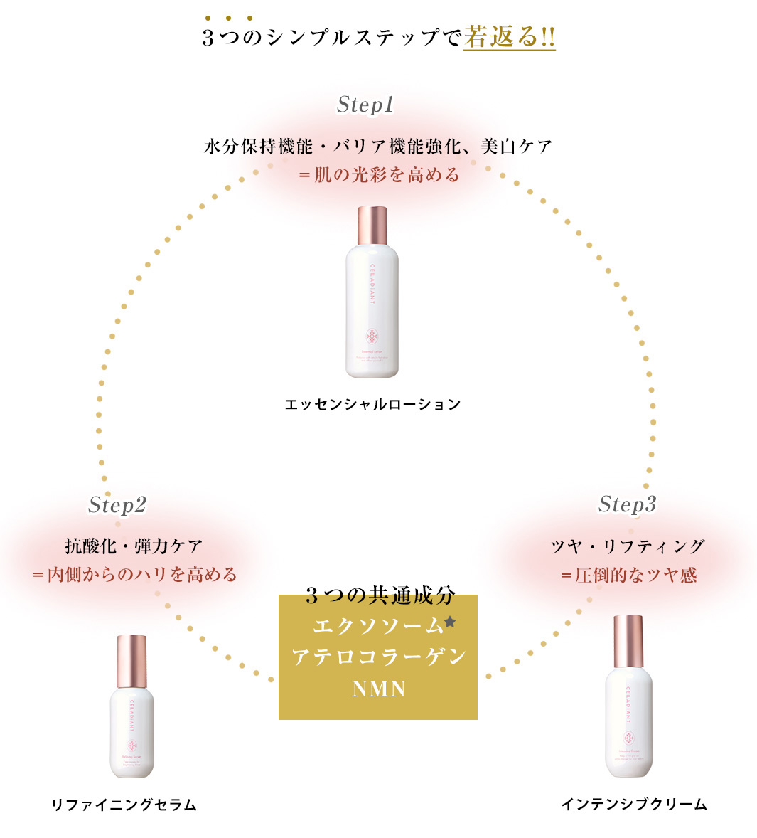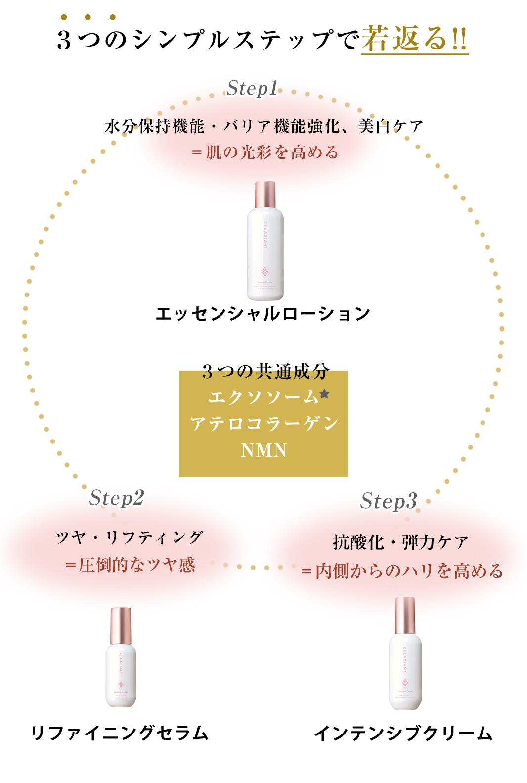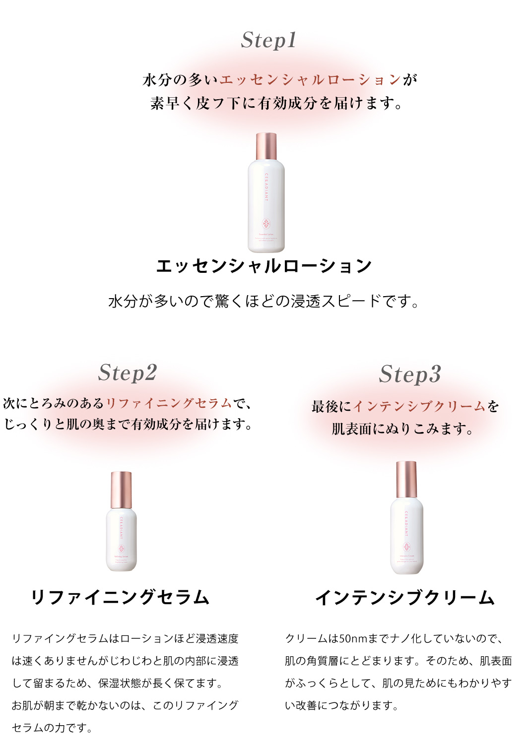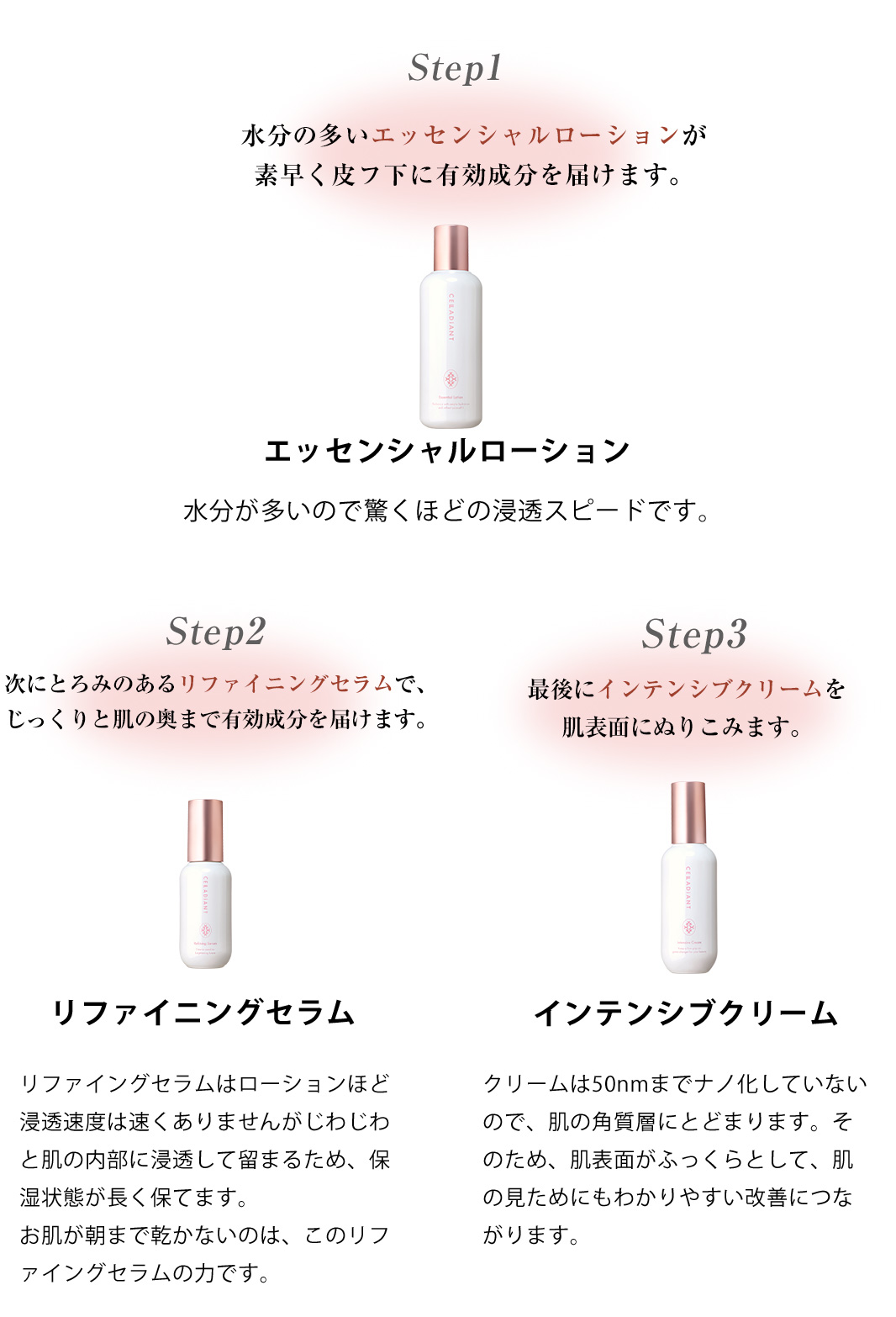①エッセンシャルローション ②リファイニングセラム ③インテンシブクリーム